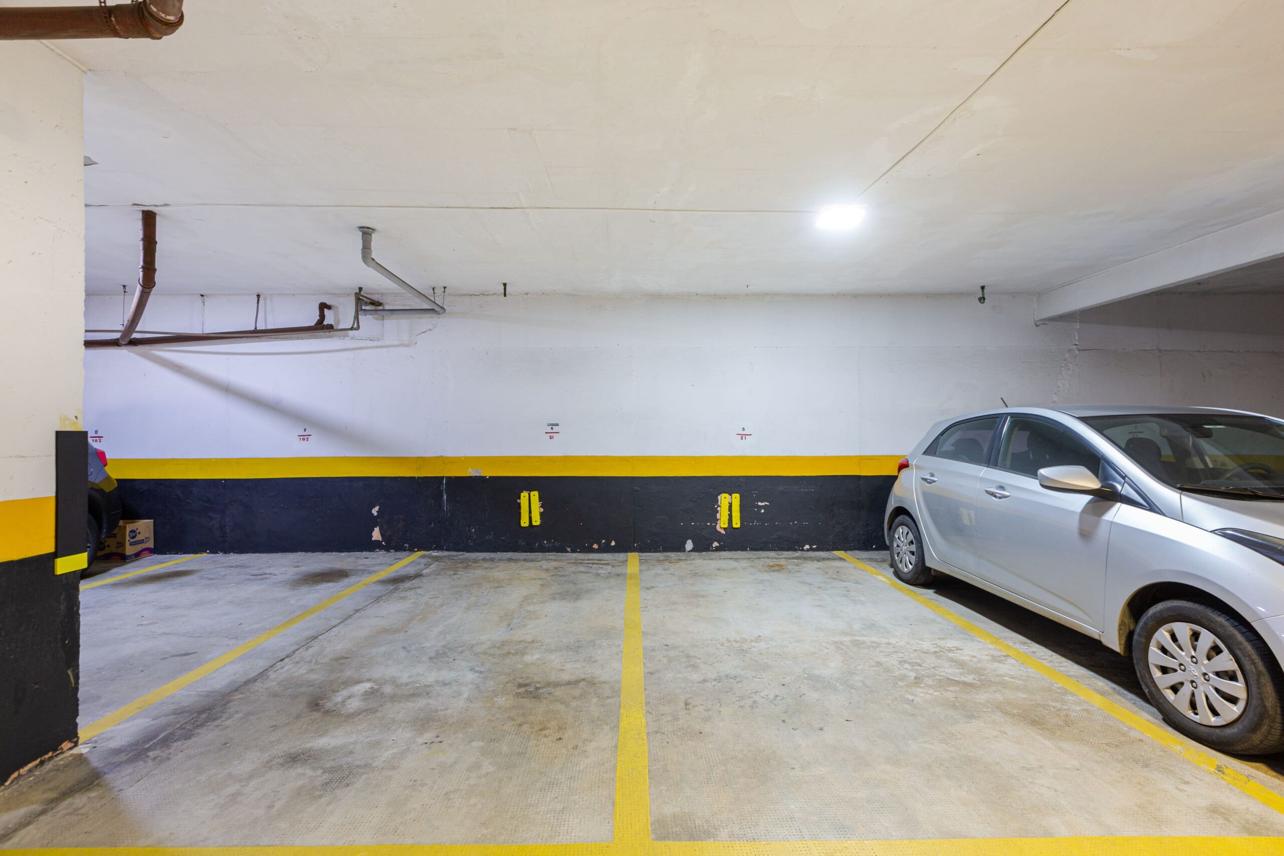 > Garagem coberta para moradores com 2 vagas e estacionamento externo com 3 vagas para visitantes.