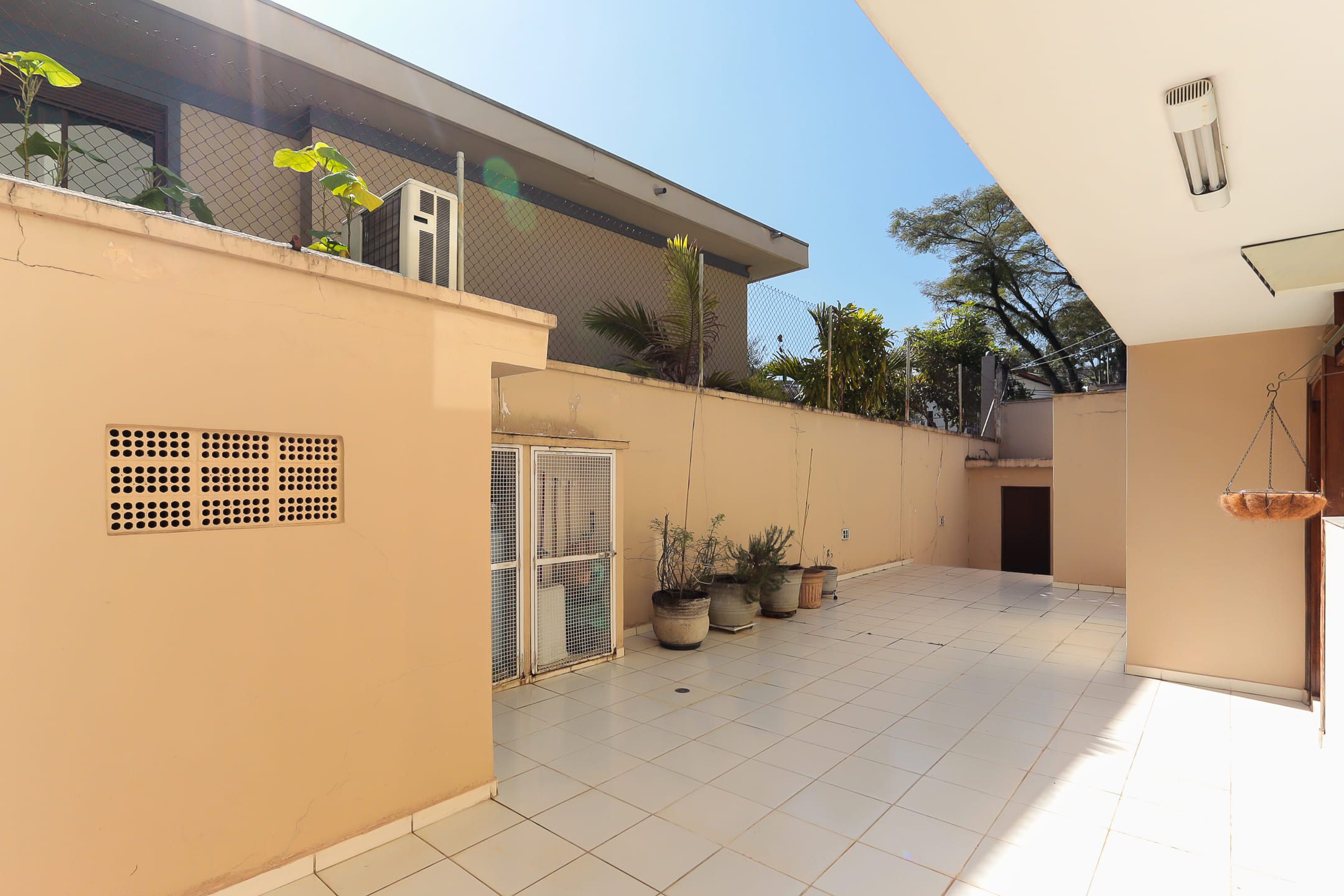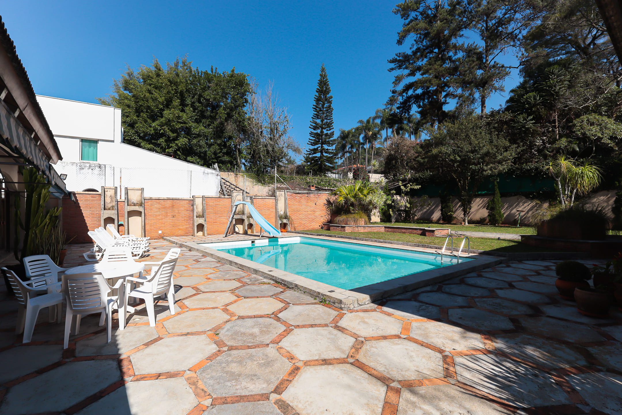 > Área externa completa com quintal, jardim, churrasqueira, salão de festas e vestiário.
