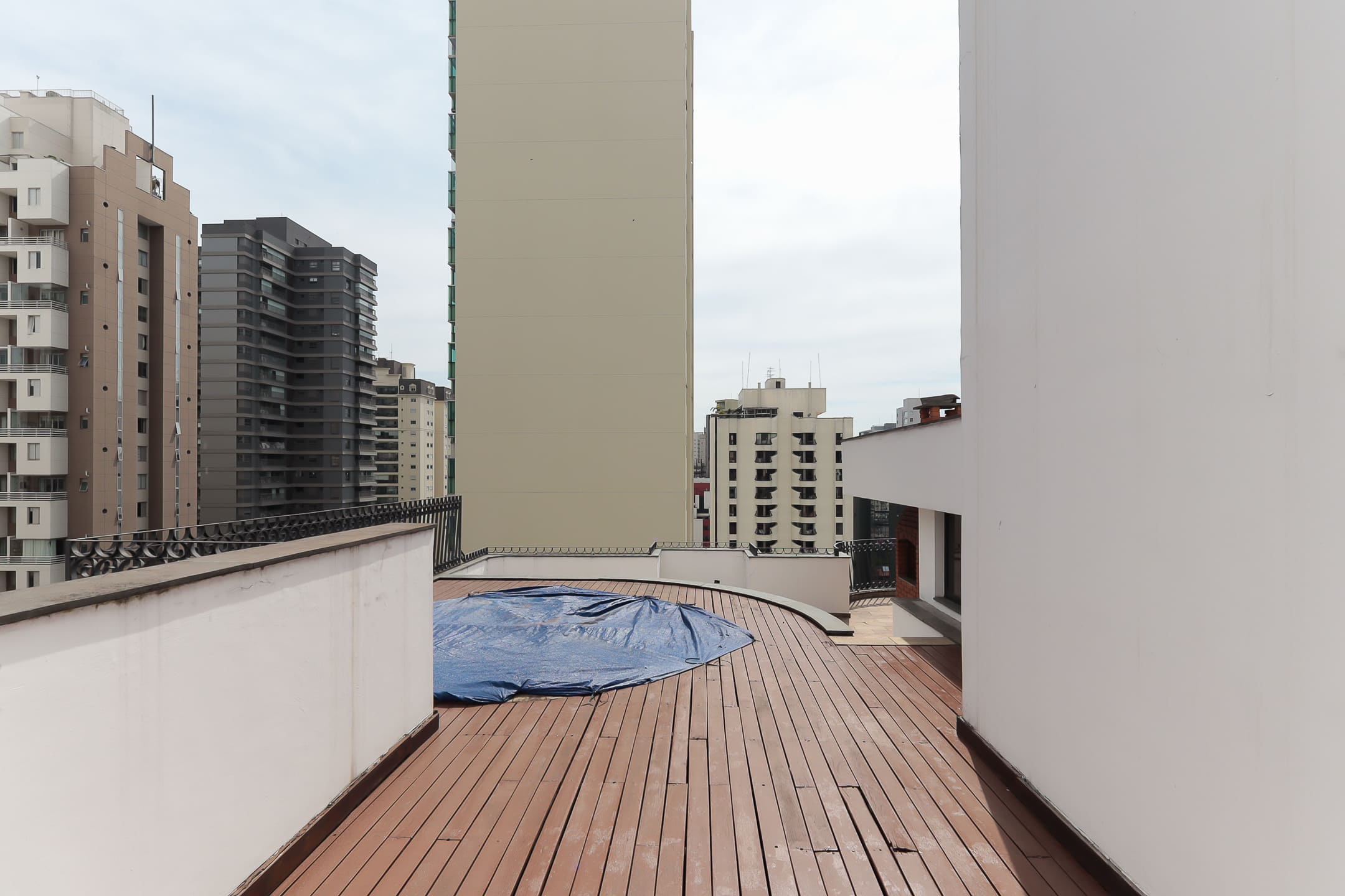 > Área privativa externa com varanda, deck de madeira, piscina e churrasqueira.